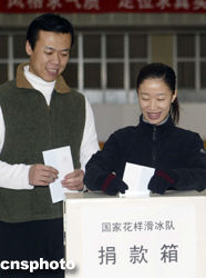 一月十日日,中國國家花樣滑冰隊在北京首都體育館花樣滑冰訓(xùn)練場舉行向東南亞海嘯災(zāi)民捐款活動。中國花樣滑冰名將申雪、趙宏博當(dāng)場捐獻(xiàn)出一個月工資。作者:盛佳鵬