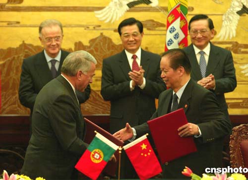中國與葡萄牙一月十二日在北京簽署多個(gè)雙邊合作協(xié)議文本,中國國家主席胡錦濤與葡萄牙總統(tǒng)桑帕約出席簽字儀式。作者:滿會(huì)喬