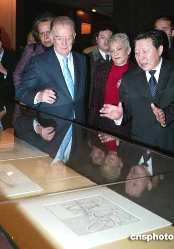《葡萄牙覓見中國》展覽一月十三日在北京開幕,葡萄牙總統(tǒng)桑帕約(左二)在中國文化部長孫家正(右一)陪同下參觀展出的中國古觀象臺圖紙。作者:滿會喬