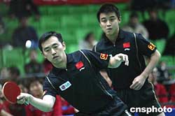 圖為中國(guó)乒乓球隊(duì)員孔令輝、王浩在義賽比賽中。作者:盛佳鵬