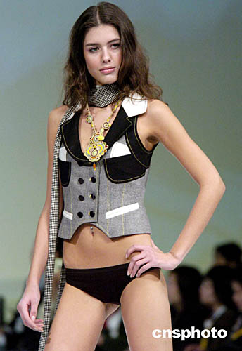 1月19日,在香港舉行的“香港時裝節(jié)秋冬系列2005”上,一臺獨家時裝表演專場為觀眾帶來青年設(shè)計師及品牌精選,圖為模特展示GEESSEN品牌作品。作者:洪少葵