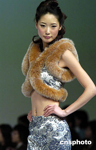 1月19日,香港會展中心舉行的“香港時(shí)裝節(jié)秋冬系列2005”上,模特展示一款皮草披肩。作者:洪少葵