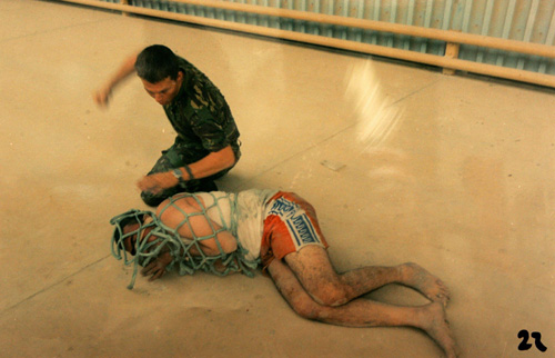 目前法庭已向媒體公布了22張這些士兵的“虐囚”圖片。這些照片在2003年5月被士兵當作實施這些行為的“紀念品”而攝下,虐囚的地點則是在伊拉克南部城市巴士拉的一家救援物資倉庫。