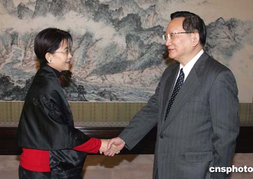 一月二十四日上午,國務(wù)委員唐家璇在北京中南海會見洪秀柱等臺灣海峽兩岸聯(lián)合經(jīng)貿(mào)協(xié)會參訪團(tuán)成員。作者:毛建軍