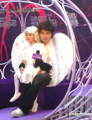 香港歌星古巨基與一小天使25日來到香港時代廣場﹐登上為情人節(jié)特別裝飾的“愛神丘比特南瓜車”上﹐傾訴他的深情蜜語﹐迎接情人節(jié)的到來。作者:趙振清