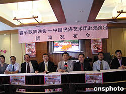 | 以西藏藝術(shù)家為主的中國(guó)民族藝術(shù)團(tuán),將于2005年春節(jié)期間赴澳大利亞巡回演出,為當(dāng)?shù)厝A人華僑歡度春節(jié)增添喜慶氣氛。澳中文化科技促進(jìn)會(huì)會(huì)長(zhǎng)馮敦平博士(左4)當(dāng)?shù)貢r(shí)間1月27日在悉尼華埠舉行的新聞發(fā)布會(huì)上說,中國(guó)民族藝術(shù)團(tuán)赴澳巡演首場(chǎng)于2月11日(大年初三)在悉尼市政廳舉行。中國(guó)駐悉尼總領(lǐng)事館文化領(lǐng)事尹亞利(右4)說,這一被中國(guó)文化部譽(yù)為“國(guó)家杰出文化團(tuán)體”,此后將赴堪培拉參加澳大利亞多元文化藝術(shù)節(jié),并到阿德萊德、墨爾本、黃金海岸和布里斯班等地巡演。作者:劉雨生