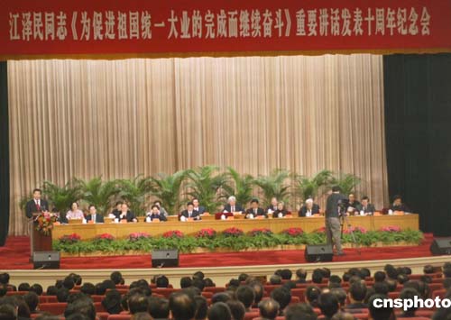 國(guó)務(wù)院臺(tái)灣事務(wù)辦公室主任陳云林在北京人民大會(huì)堂舉行的紀(jì)念江澤民對(duì)臺(tái)八項(xiàng)主張發(fā)表十周年大會(huì)上,代表中共中央臺(tái)辦、國(guó)務(wù)院臺(tái)辦和海峽兩岸關(guān)系協(xié)會(huì)祝臺(tái)灣同胞新春愉快,合家歡樂(lè),萬(wàn)事如意。作者:史利