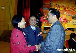 一月三十日,“二○○五年廣西首府僑界迎春茶話會(huì)”在南寧舉行,三百多名僑界人士到會(huì),世界廣西同鄉(xiāng)聯(lián)誼會(huì)主席陳奇培、馬來西亞廣西總會(huì)會(huì)長(zhǎng)孔慶庶等海外僑領(lǐng)也出席了茶話會(huì)。廣西自治區(qū)政府副主席劉新文女士(左)、廣西自治區(qū)僑辦主任李漢金(中)和出席茶話會(huì)的海外僑領(lǐng)親切交談。作者:劉萬強(qiáng)