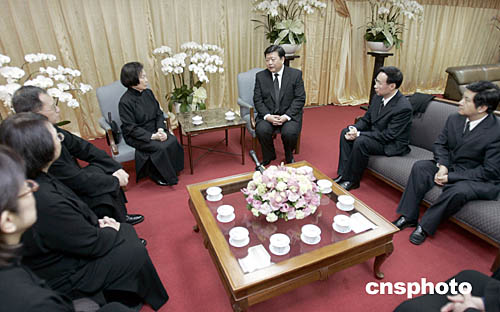 孫亞夫、李亞飛今天下午抵達臺北,四點三十五分前往靈堂吊唁辜振甫先生。圖為吊唁后與其家人座談。(臺灣;鶗识麻L辜振甫先生治喪工作小組提供)中新社記者:邢利宇
