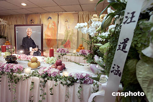 孫亞夫、李亞飛今天下午作為汪道涵先生的個人代表抵達(dá)臺北來靈堂吊唁辜振甫先生。圖中辜先生靈堂擺設(shè)有汪道涵先生贈送的花籃。(臺灣;鶗识麻L辜振甫先生治喪工作小組提供)中新社記者:邢利宇