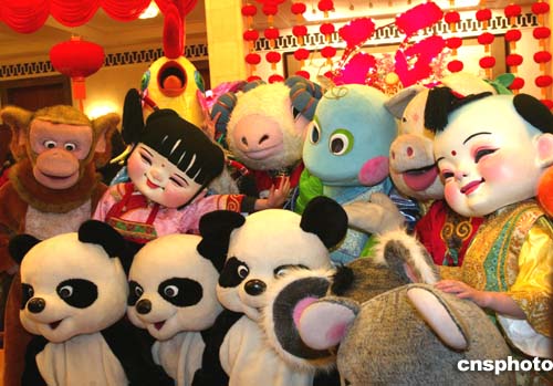 走進(jìn)張燈結(jié)彩的人民大會(huì)堂,噴泉涌動(dòng),鮮花爭(zhēng)艷,迎面兩個(gè)賀歲的“阿!睋碇皦坌恰毕蛉藗児зR新喜,彩燈閃爍的“!弊直磉_(dá)著新春的祝福。大型充氣“雞型”、“龍型”滑梯和“燈籠”、“蘑菇”城堡成了孩子們的樂(lè)園。
