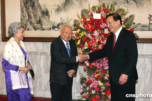 中國國務(wù)委員唐家璇二月七日在北京釣魚臺國賓館會見柬埔寨前國王西哈努克。作者:毛建軍