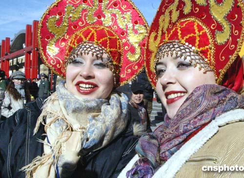 二零零五北京朝陽(yáng)國(guó)際風(fēng)情節(jié)二月九日(正月初一)在北京朝陽(yáng)公園開(kāi)幕,連續(xù)七天的國(guó)際風(fēng)情節(jié),將為京城市民及中外游客上演豐富多彩的異國(guó)風(fēng)情文化及中西美食。圖為來(lái)自俄羅斯風(fēng)情舞蹈團(tuán)的姑娘興高采烈游園觀光。作者:錢興強(qiáng)