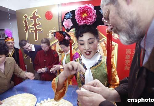 二月八日是中國傳統(tǒng)的除夕之夜,來自法國、英國等國家的六十余位外國友人在北京朝陽麥子店街道社區(qū)度過了一個(gè)極富中國傳統(tǒng)民俗特色的除夕之夜,他們與社區(qū)居民一同看演出、品嘗中國傳統(tǒng)美食、對對聯(lián)、學(xué)做中國手工水餃。作者:任海霞