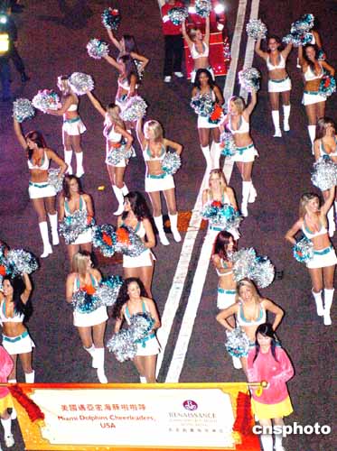 來自美國(guó)的邁阿密海豚啦啦隊(duì),二十五位貌美女郎,穿著性感上衣及熱褲,手執(zhí)啦啦球勁歌熱舞,齊齊向觀眾道來“恭喜發(fā)財(cái)!wel-cometoHongKong!”