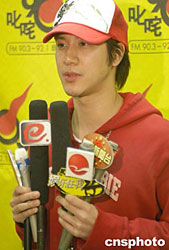 歌星王力宏2月18日在香港出席商業(yè)電臺節(jié)目“叱咤樂壇”錄音訪問,他向傳媒展示可以避邪的金屬飾物。作者:鄧慶樂