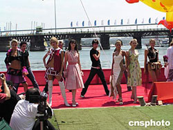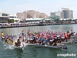 悉尼市2005年中國農(nóng)歷新年慶典活動的壓軸戲——龍舟競賽,于19日和20日在達(dá)令港隆重舉行。此次龍舟競賽共有近百個龍舟隊參加,爭奪不同年齡組別的冠軍。上圖為開幕典禮上的服裝表演。下圖為龍舟隊員戲水慶祝比賽開幕.作者:劉雨生