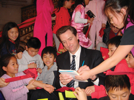 來自尤方玉屏中文學(xué)校的數(shù)十位小學(xué)生成為慶會的另一亮點(diǎn),這些滿臉稚氣的學(xué)童,排排坐在通往二層的樓梯上,簇?fù)碇贻p英俊的紐森市長,就像遇到偶像明星一樣,紛紛向他索要簽名。