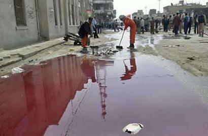從美聯(lián)社記者拍到的電視畫面上看到,希拉鎮(zhèn)負責搶救傷員的診所外面,流了一灘一灘的鮮血。診所的墻壁上,明顯有爆炸燒焦的痕跡,幾十名伊拉克人圍在一起,幫忙把死者肢體往毯子里裝殮。在一個墻角,死傷者的鞋底和破爛的衣服堆在一起。