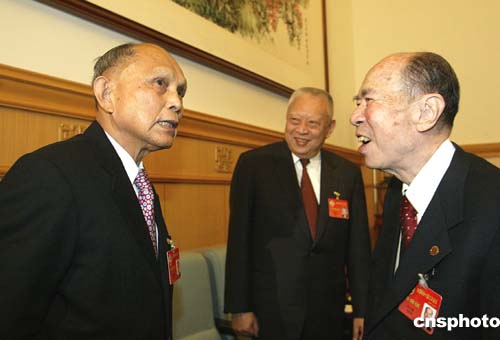 全國(guó)政協(xié)十屆三次會(huì)議三月三日在北京開幕,全國(guó)政協(xié)副主席霍英東、馬萬(wàn)祺與香港特首董建華在出席大會(huì)時(shí)互致問(wèn)候。作者:廖文靜