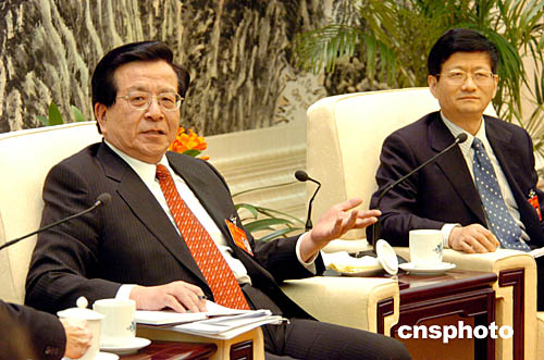 中共中央政治局常委、國家副主席曾慶紅三月五日到全國人大江西團(tuán)與代表們一起審議溫家寶總理所作政府工作報告。 作者:陳文