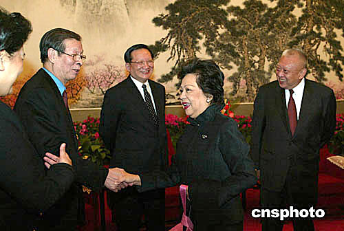 國家主席胡錦濤三月五日在北京會見香港特別行政區(qū)行政長官董建華,國務(wù)委員唐家璇、國務(wù)院港澳辦主任廖暉等在會見后與特首夫人互致問候。作者:滿會喬