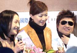 三月六日,在北京舉行的中國內(nèi)地影視、歌壇紅星周迅新專輯《偶遇》上市發(fā)行儀式上,內(nèi)地歌手韓紅(右)、葉蓓(中)在會上向周迅表示祝賀。作者:錢興強