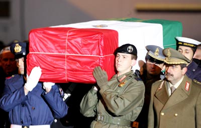 據(jù)路透社報(bào)道,遭駐伊拉克美軍射殺的意大利特工遺體被送返國(guó)內(nèi)時(shí),獲得英雄式的歡迎?ɡ屠锏墓啄居蒀-130軍機(jī)在3月5日午夜送抵羅馬錢(qián)比諾機(jī)場(chǎng)。當(dāng)覆有意大利國(guó)旗的卡利巴里棺木由儀仗隊(duì)抬出時(shí),他的母親和女兒都泣不成聲。