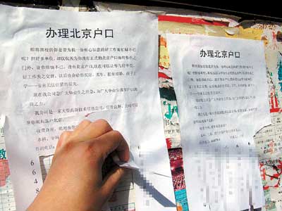 昨日中午,記者在北京林業(yè)大學(xué)餐廳外,發(fā)現(xiàn)路旁有兩塊宣傳欄,上面貼滿了考研信息的廣告。在知情人的指引下,記者在宣傳欄背后發(fā)現(xiàn)了戶口辦理廣告!稗k理北京戶口”幾個(gè)大字很顯眼,正文用了一半的篇幅來“闡述”畢業(yè)生沒有北京戶口帶來的“無法估量的損失”。接著該廣告稱,該公司是一家大型高新技術(shù)信息公司、“信譽(yù)良好”,并保證“幫你順利落戶北京”,“收費(fèi)合理,絕對(duì)保您滿意!”廣告最后注明費(fèi)用為5萬元,并留下該公司聯(lián)系電話。