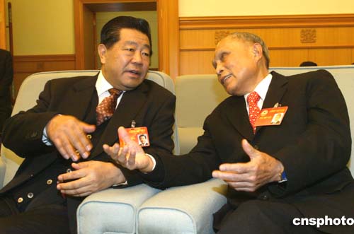 全國(guó)政協(xié)十屆三次會(huì)議第三次全體大會(huì)三月九日在北京人民大會(huì)堂舉行。全國(guó)政協(xié)主席賈慶林與副主席霍英東在會(huì)前交談。作者:廖文靜
