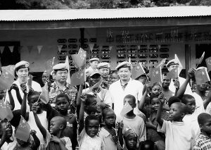 望著這些可憐的孩子,潘興太等隊(duì)員決定親自動手,利用原來裝醫(yī)療用品的木箱,為師生制作一批課桌椅。一個(gè)星期后,當(dāng)隊(duì)員們將20多張像模像樣的課桌椅送到該校時(shí),180多名“黑孩子”和他們僅有的4位老師已早早地列隊(duì)守候在校門口。孩子們一接過隊(duì)員們親手做的課桌和板凳,“CHINA”、“BEI鄄JING”聲就不絕于耳。