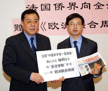 儀式上,法國(guó)“中國(guó)和平統(tǒng)一促進(jìn)會(huì)”執(zhí)行會(huì)長(zhǎng)楊明、法國(guó)法華工商聯(lián)合會(huì)會(huì)長(zhǎng)劉若申、法國(guó)企業(yè)界人士將各自捐贈(zèng)的報(bào)紙數(shù)額顯示牌分別交到全法學(xué)聯(lián)主席陳鵬、中國(guó)大使館教育處安少康一等秘書等人手中。捐贈(zèng)時(shí)限為一年。