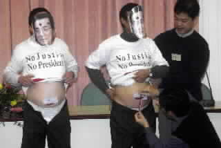 中新網(wǎng)3月14日電 “319槍擊案”發(fā)生將屆滿一周年,臺灣的“國策會”13日舉辦研討會,找來5名體型和陳水扁相似的志愿民眾,依照刑事局和李昌鈺的鑒識報(bào)告,把褲子穿在肚臍以下8厘米的位置,而內(nèi)褲則穿在肚臍以下14厘米的位置;藉此諷刺陳水扁“319”當(dāng)天穿著“低腰褲”,掃街拜票;更抨擊鑒識報(bào)告的公正性。