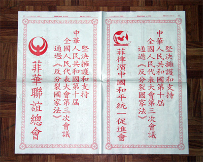 3月14日,《反分裂國家法》以高票通過后,菲律賓中國和平統(tǒng)一促進(jìn)會、菲華各界聯(lián)合會、菲律賓晉江同鄉(xiāng)會、菲律賓中國洪門致公黨總部、菲律賓石獅同鄉(xiāng)會、菲律賓僑中學(xué)院等社團(tuán)和文教單位,立即在各大華文報紙上刊登大幅套紅賀詞,堅決擁護(hù)和支持全國人大通過的《反分裂國家法》。