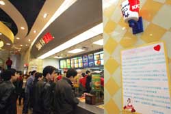 三月十七日,上?系禄诓蛷d里張貼聲明,解釋“蘇丹紅一號(hào)事件”。十六日晚,在肯德基新奧爾良烤翅和新奧爾良烤雞腿堡調(diào)料中發(fā)現(xiàn)了“蘇丹紅一號(hào)”成分。為了確保萬(wàn)無(wú)一失,該公司決定立即在全國(guó)所有肯德基餐廳停止售賣新奧爾良烤翅和新奧爾良烤雞腿堡兩種產(chǎn)品,同時(shí)銷毀所有剩余調(diào)料。圖為徐家匯一家肯德基餐廳里張貼了聲明。作者:潘索菲