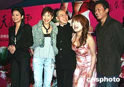 榮獲柏林電影節(jié)銀熊獎(jiǎng)的臺(tái)灣電影《天邊一朵云》在全臺(tái)公映。該片因有暴露的性愛鏡頭而引起一些爭議。圖為3月18日晚,臺(tái)灣著名導(dǎo)演蔡明亮(中)與該片主要演員出席在臺(tái)北舉行的首映式。作者:董會(huì)峰
