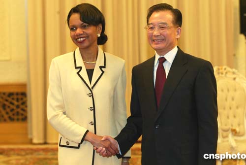快訊:中國(guó)國(guó)務(wù)院總理溫家寶會(huì)見(jiàn)美國(guó)國(guó)務(wù)卿賴斯