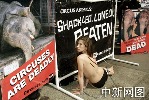 2005年3月22日,美國人道對待動物協(xié)會的會員裸體躺在時代廣場上,抗議玲玲馬戲團(tuán)(Ringling Brother and Barnum & Bailey Circus)在紐約演出。他們帶著手銬腳鐐,身上涂著假傷疤,抗議動物在馬戲團(tuán)遭受虐待。