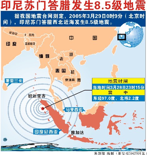 印度尼西亞蘇門答臘島附近海域當(dāng)?shù)貢r(shí)間28日23時(shí)9分(北京時(shí)間29日零時(shí)9分)發(fā)生里氏8.5級(jí)強(qiáng)烈地震,印度洋沿岸國家隨即發(fā)出了海嘯警報(bào)。印尼警方說,地震可能已造成數(shù)百人死亡或失蹤。