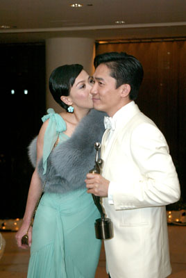 “偉仔”與嘉玲在頒獎(jiǎng)禮結(jié)束不久即抵達(dá)慶功宴會(huì)場(chǎng),五度稱帝的他一直面露笑容,上臺(tái)領(lǐng)獎(jiǎng)時(shí)的緊張一掃而空,嘉玲更即場(chǎng)吻賀男友。“偉仔”解釋,他上臺(tái)時(shí)的心情就好像第一次拿獎(jiǎng)一樣緊張,因他已因?yàn)椤痘幽耆A》里的周慕云而奪得影帝,今次在《2046》里再演同一個(gè)角色,要能夠拿兩次獎(jiǎng),難度非常高。因此,他對(duì)獲獎(jiǎng)感到十分開心,但同時(shí)又承認(rèn)并不覺得太意外,因他之前已憑《2046》奪得香港電影評(píng)論學(xué)會(huì)的“最佳男演員”獎(jiǎng),自然也想再在金像獎(jiǎng)得獎(jiǎng)。對(duì)于成為五屆影帝,他只以“好彩”來形容,說自己運(yùn)氣好,王家衛(wèi)“腳頭”也好。另外,出爐影后章子怡繼續(xù)其“少話”本色,慶功宴上仍來去匆匆,不肯多談感受,只表示很開心,已經(jīng)即時(shí)致電家人及朋友報(bào)喜。