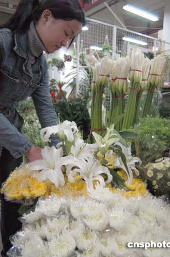 清明節(jié)前北京鮮花市場需求激增,每天約有十萬枝黃白色菊花、白百合和馬蹄蓮等素色鮮花由產(chǎn)地運(yùn)來京城,以供北京清明祭掃之需。作者:徐曦弋