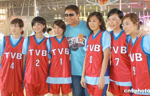 香港電視劇《學(xué)警雄心》為加強(qiáng)宣傳,15日與警察籃球代表隊(duì)舉行友誼賽,眾多女藝員加盟此次活動(dòng)。圖為香港藝員苗僑偉(男)為女藝員們打氣助威。