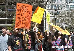 世界銀行春節(jié)會(huì)議在華盛頓舉行之際,美國示威者于美東時(shí)間4月16日中午到世行大樓外集會(huì),抗議美國國防部副部長(zhǎng)沃爾福威茨出任世界銀行新任行長(zhǎng)。作者:余東暉