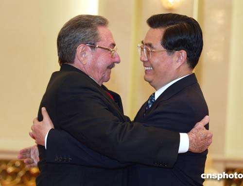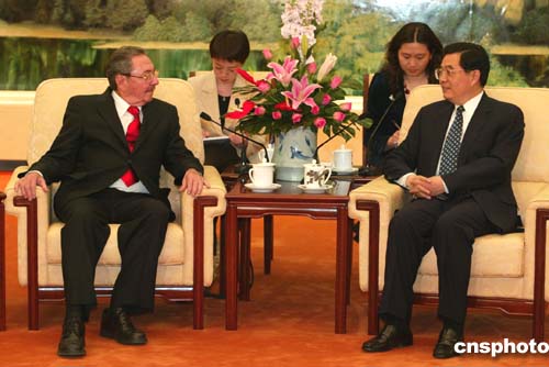 中新社北京四月十八日電(記者張朔)中共中央總書(shū)記、國(guó)家主席胡錦濤今天下午在人民大會(huì)堂會(huì)見(jiàn)了古共中央第二書(shū)記、國(guó)務(wù)委員會(huì)第一副主席兼部長(zhǎng)會(huì)議第一副主席勞爾·卡斯特羅,雙方進(jìn)行了親切友好的談話(huà)。