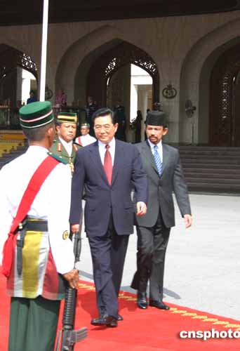 胡錦濤是應(yīng)文萊達魯薩蘭國蘇丹哈桑納爾的邀請,對文萊進行國事訪問的。文萊王儲夫婦到機場迎接。
