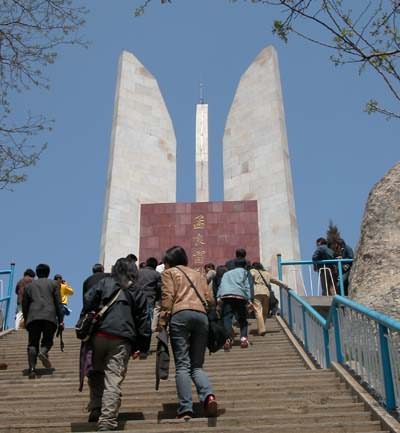 1984年為紀(jì)念孟良崮戰(zhàn)役在山上修建的紀(jì)念碑高30米,由三塊狀如刺刀的灰色花崗石筑成,象征著野戰(zhàn)軍、地方軍和民兵的武裝力量體制。底座為邊長(zhǎng)20米、高1.6米的正三棱體,組成一個(gè)槍托,意喻槍桿子里面出政權(quán)。紀(jì)念碑的上下部構(gòu)成一個(gè)有機(jī)的整體,象征著軍民團(tuán)結(jié)必勝,人民戰(zhàn)爭(zhēng)必勝。