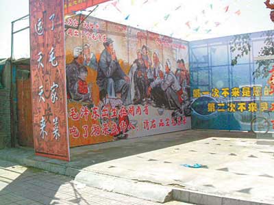 北京海淀區(qū)一家酒樓把毛主席與農(nóng)民座談時的場景設(shè)計為廣告牌,懸掛在店外,并寫著“吃了湘菜成偉人”的廣告語。