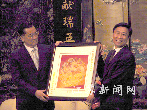 李源潮向連戰(zhàn)贈(zèng)送了禮品,是一副南京特產(chǎn)云錦織出的金絲團(tuán)龍。李源潮說(shuō):龍是中華民族的象征。連戰(zhàn)向江蘇省回贈(zèng)了禮品,是臺(tái)灣的三羊開(kāi)泰瓷瓶,連戰(zhàn)說(shuō):以此祝愿江蘇發(fā)展、興旺。