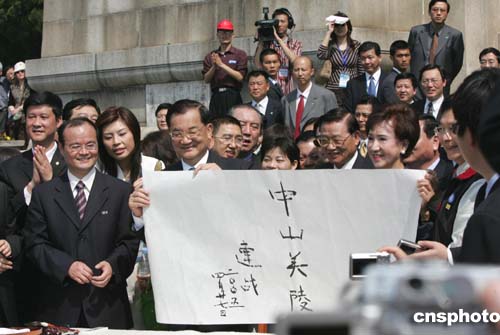 進(jìn)入墓室憑吊中山先生后,連戰(zhàn)在訪問團(tuán)成員簇?fù)硐,于祭堂前上千名市民、游客及在場記者關(guān)注下,提筆為中山陵寫下“中山美陵”四個(gè)大字,全場以熱烈掌聲來回應(yīng)。一九一二年四月一日,孫中山與胡漢民等在紫金山一帶打獵,并表示逝世后,當(dāng)向國民乞求這塊土地以安葬。一九二五年在北京彌留之際,仍以歸葬鐘山為囑;同年三月十二日孫中山先生在北京辭世,當(dāng)時(shí)國民政府很快選墓址于南京紫金山;一九二九年六月一日,舉行奉安大典,將中山先生遺體由北京遷葬于南京。中山陵從此在全體中國人心中同享崇高地位。