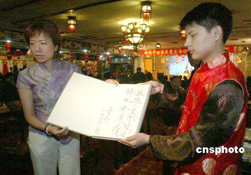 看到連戰(zhàn)神情頗為愉悅,茶館總經(jīng)理尹智君抱著試試看的心理,走到連戰(zhàn)面前,希望他為老舍茶館題詞,不料連戰(zhàn)欣然應(yīng)允,揮毫寫(xiě)下:“振興茶文化,祥和兩岸情”。